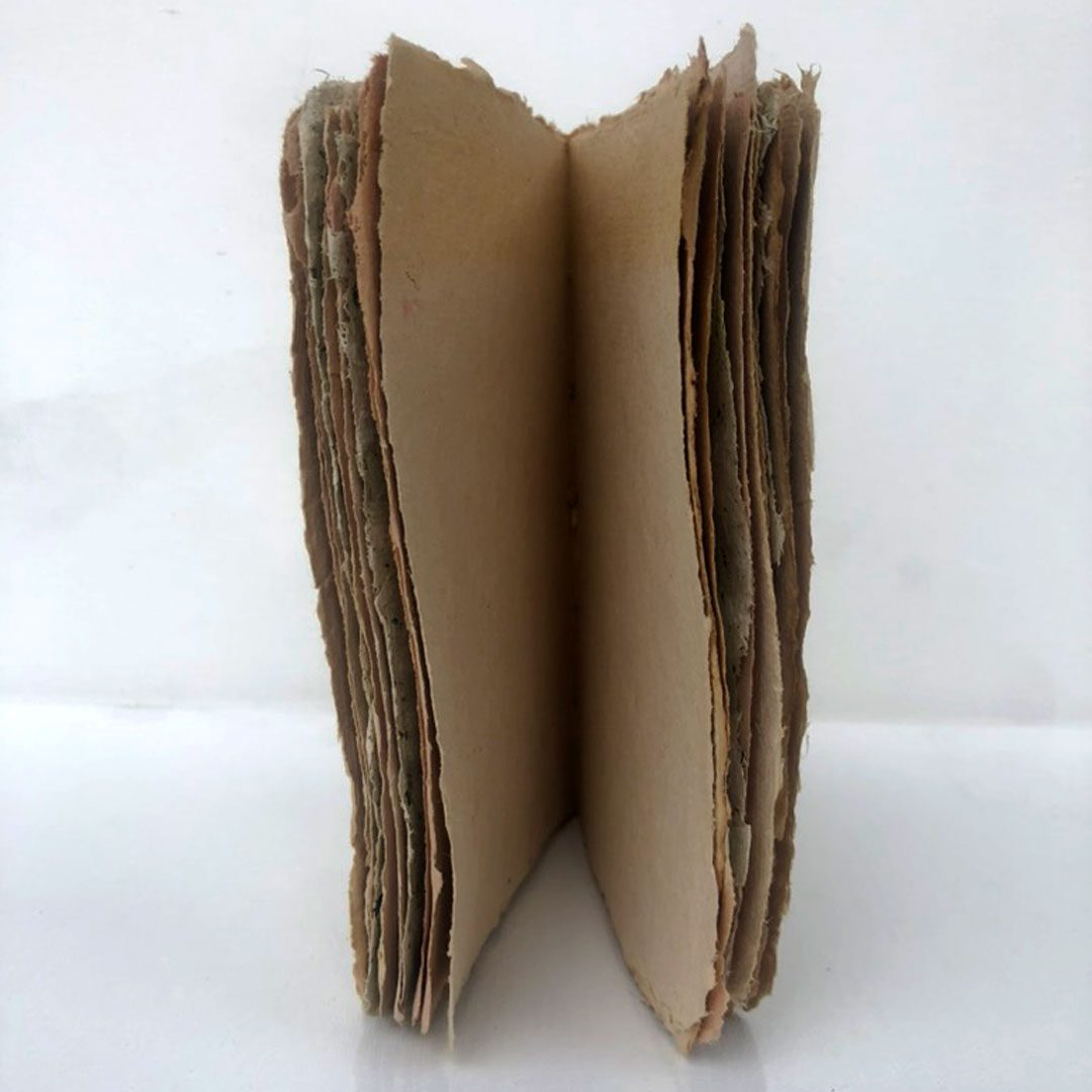 The pages are saddle-stitched by hand with beeswaxed Brazilian cord, giving the book a durable, tactile spine while preserving the intimacy of handmade craft. Within the fibers, faint marks of past life are an accidental collage as your starting point.